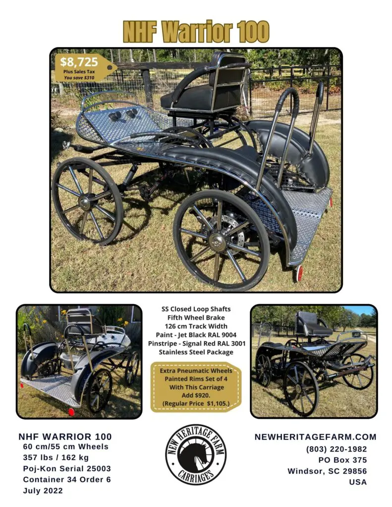 The NHF Warrior 100 is designed to take your CDE or CT competition to the next level safely and smoothly. Whether at the event or on the trails, you will not find a more comfortable and stylish drive.