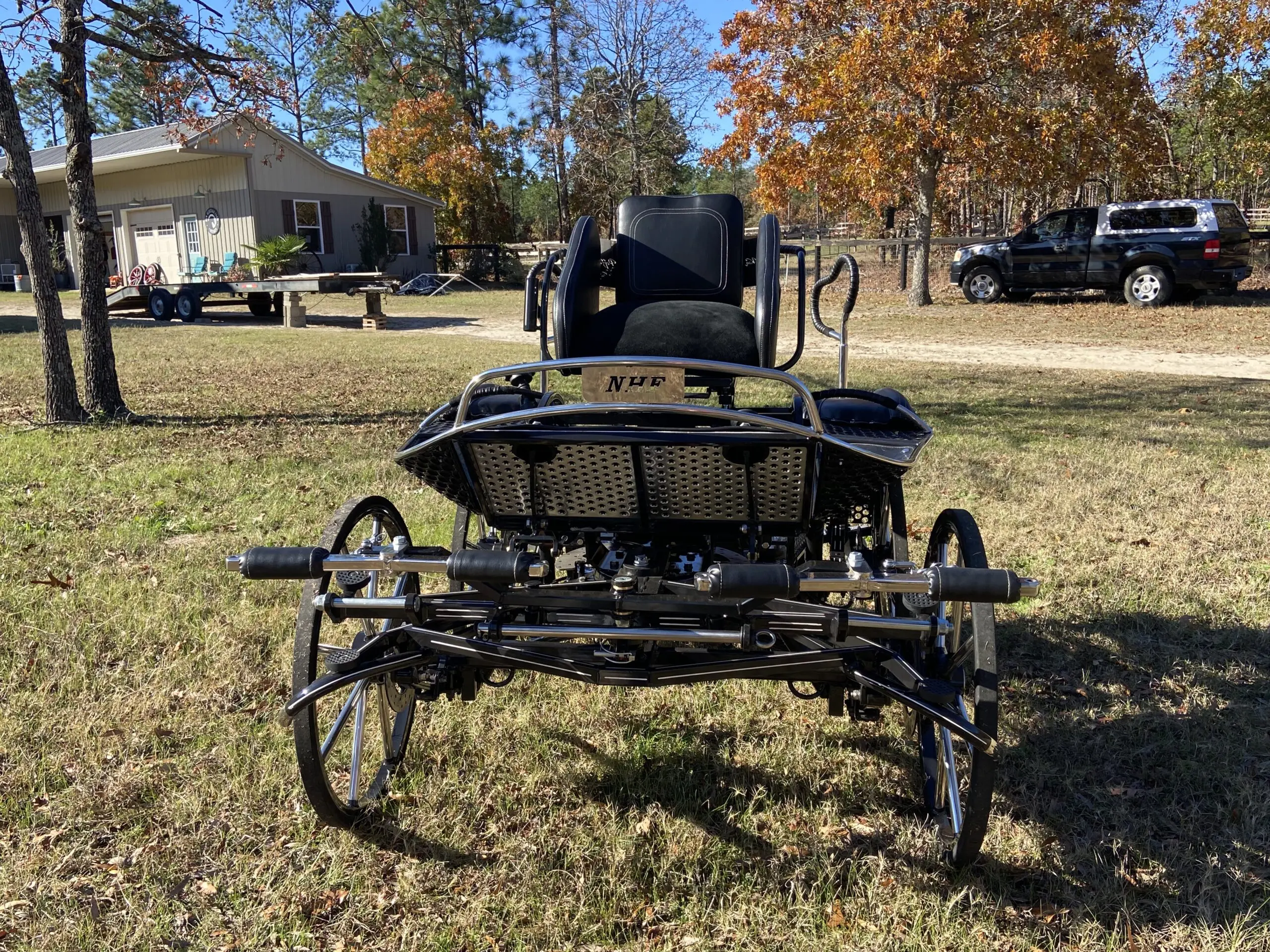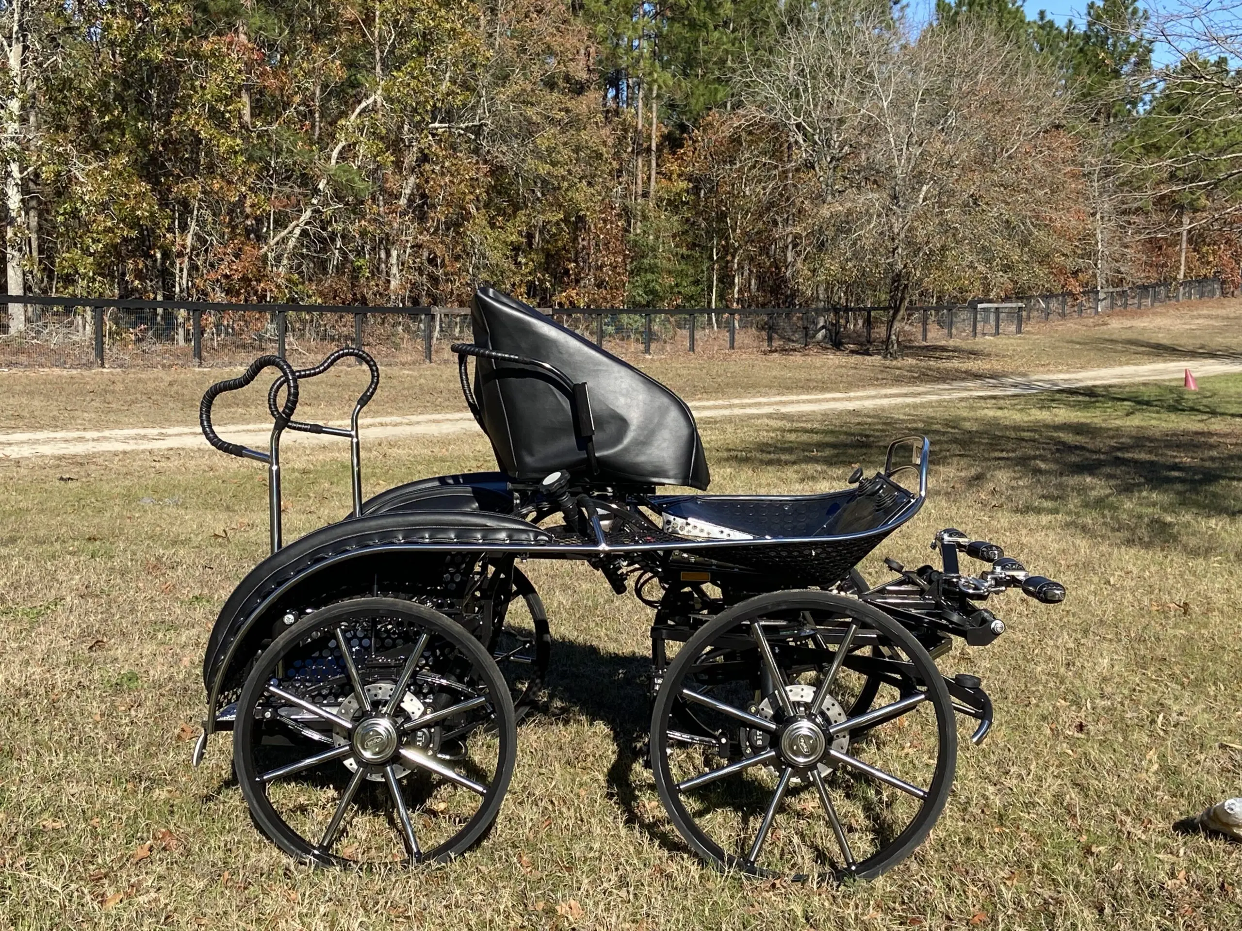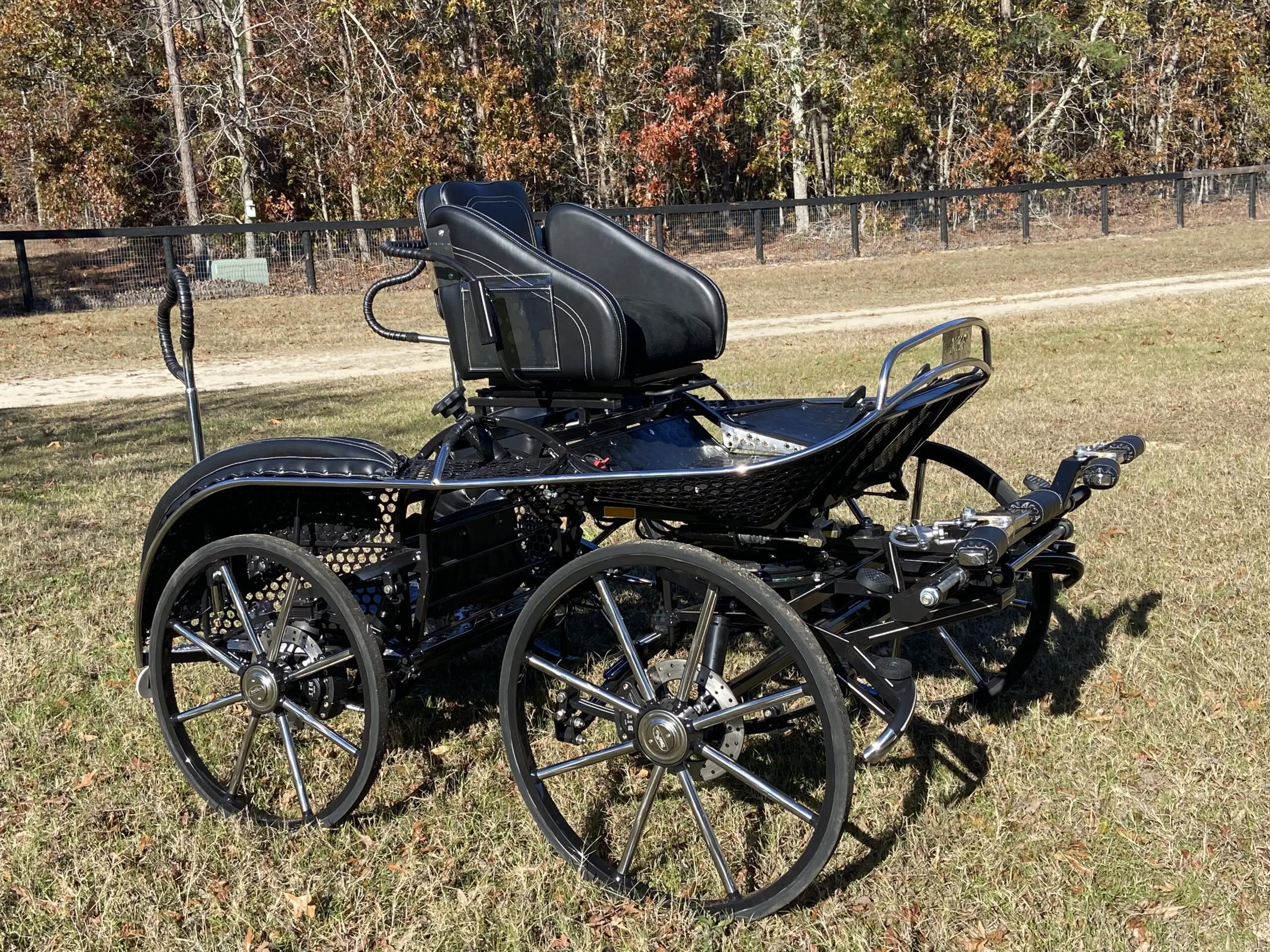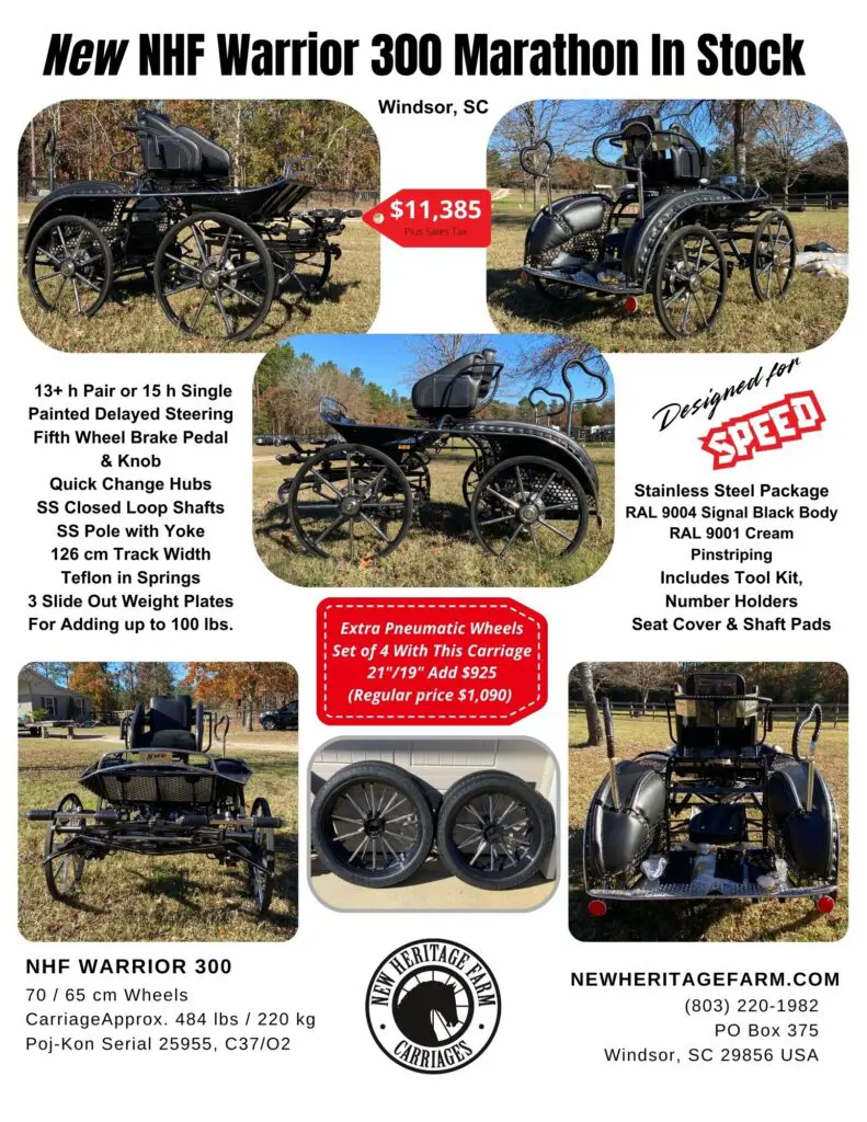 Bring your CDE to the next level with this beautiful marathon carriage designed for speed and stability. Great for training the pair with removable weight plates to slide in under the navigator platform. Lighten it up for your single and make the most of this carriage’s versatility. The NHF Warrior Marathon carriages compete all the way to the top including World Championships!
