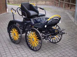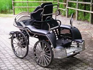 To withstand the stresses of a four-in-hand the NHF Team Marathon is built stronger and heavier than our heavy pair marathons. In addition to basic heavier steel construction the wheels come with 18 spokes instead of 12 and tires are 5cm wide in lieu of 4cm. The NHF Team Marathon comes with a standard bucket seat, movable fore and aft and to the center or an optional single center mounted seat. The base model provides the required FEI 600 kg weight.